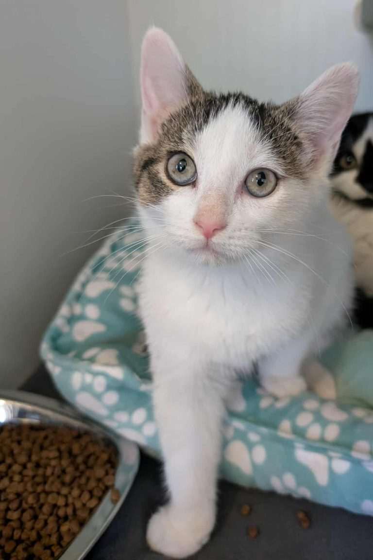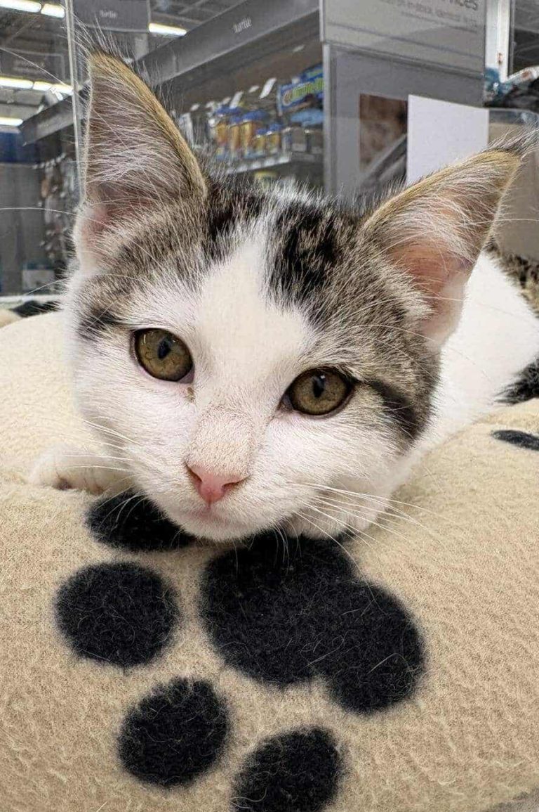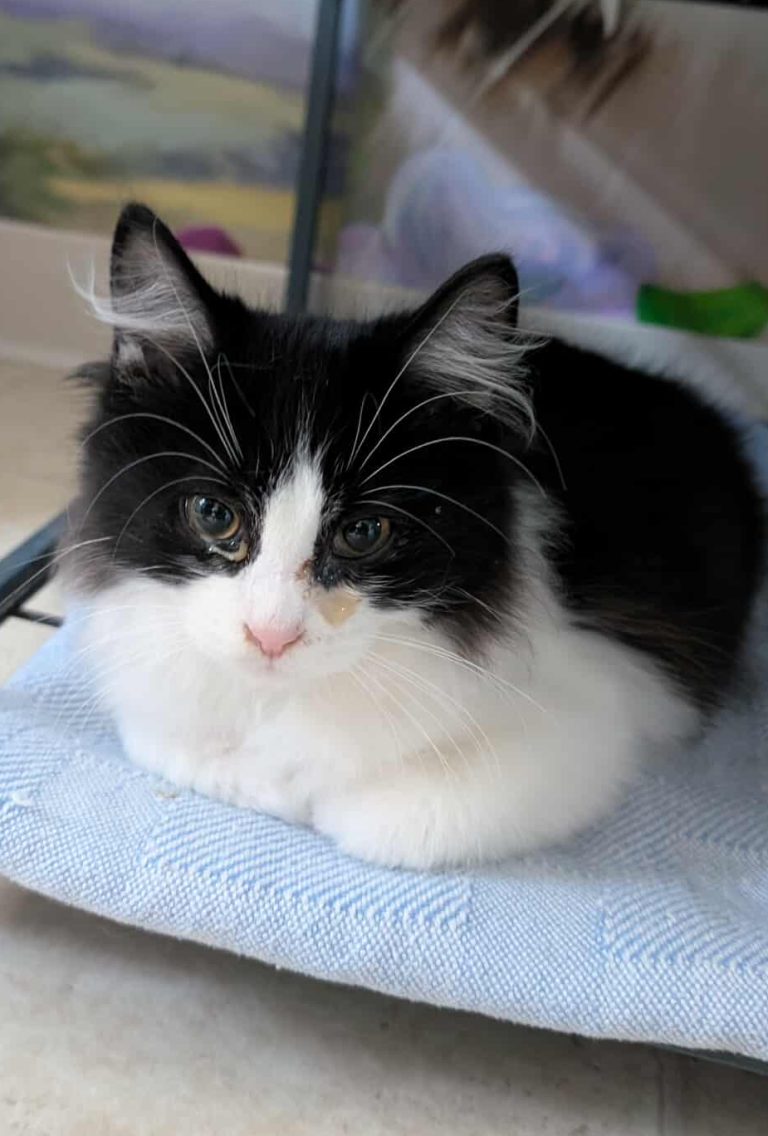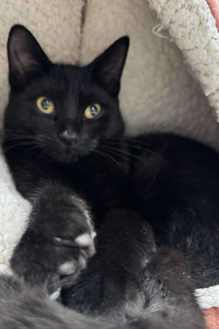 I’m a striking black and white tuxedo girl, complete with my own little white bib, cute socks, and a charming white birthmark. I’m the most outgoing cat you’ll ever meet, and I make sure everyone notices me the moment they walk in!