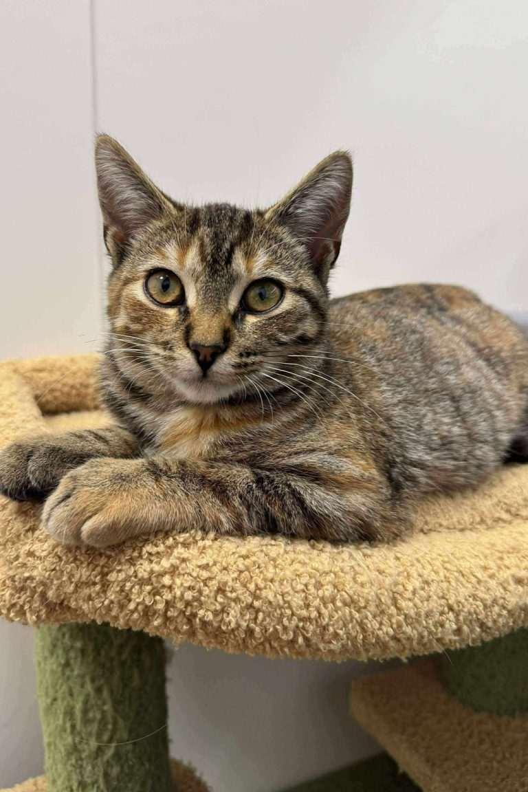 When he’s not playing with his siblings, you can usually find him enjoying the height of the cat tree or staking out a claim on the cozy shelf underneath!