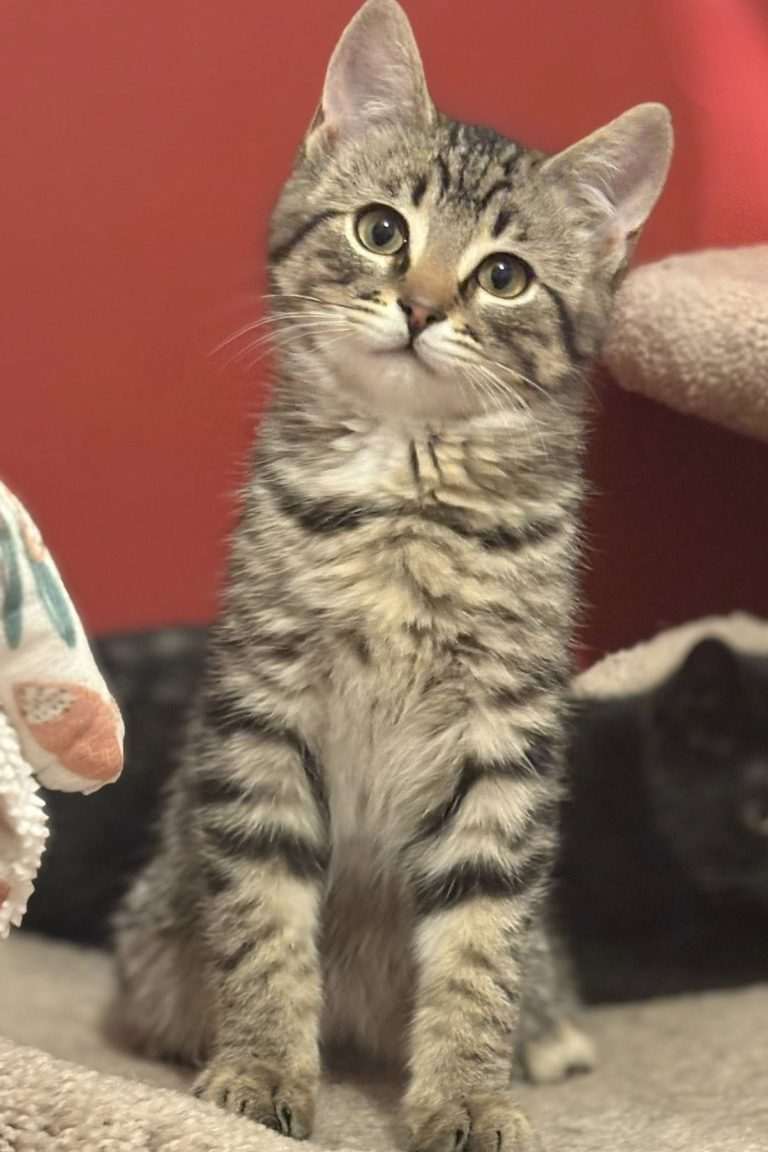 Agnes isn’t just a lap cat; she’s an explorer with a serious mischievous streak. She is completely fearless and usually the first one in her litter to try something new. Whether she’s plotting a daring escape from the foster room or investigating the highest shelf, her curious spirit is always on the go. When she isn’t busy “helping” her foster humans, Agnes is a social butterfly who loves to wrestle and chase with her siblings, and when the games are done, you can usually find her tucked away at the very top of the cat tree, curled up in a nap pile with a friend.
