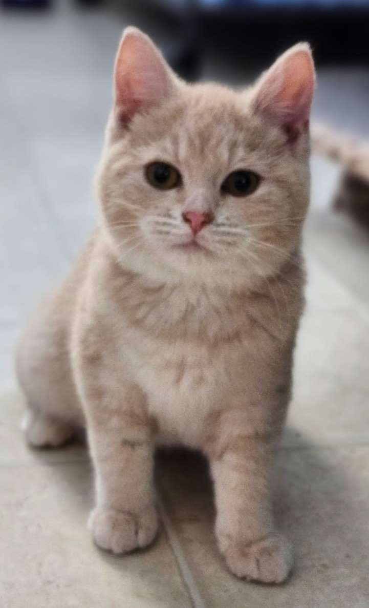 Apple is a stunning buff-colored kitten with deep, soul-stirring orange eyes that stand out beautifully against her pale golden fur. This friendly little lady is a “busy bee” who loves to spend her days investigating everything, making sure no toy “gets away” with and no cardboard box goes unexplored.