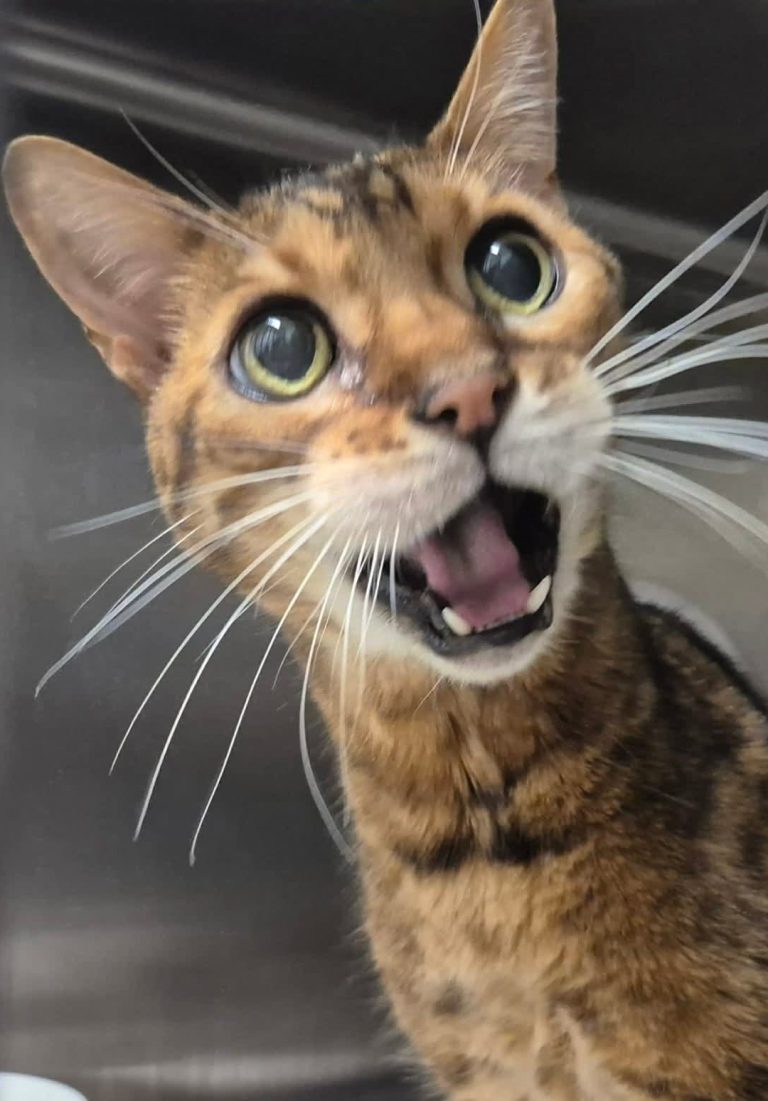 Chloe is a very outgoing girl with endless energy who sleeps as hard as she plays. She is close friends with Camelia, and will chirp and call to her when she is out of sight. She is curious about what’s happening outside and is easy to handle. She loves pets, toys, attention, and adores catnip kickers.