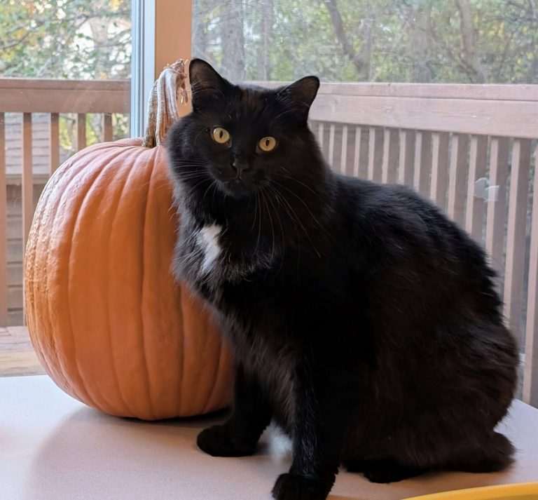 Autumn is highly bonded with her sister, Harvest; they are the best of friends, constantly cuddling, grooming each other, and have never fought. The sisters share a secret love for Temptations treats (which must be locked up at night, as they will try to steal the bag!). Playful, especially in the evenings, Autumn is looking for a calm home without other pets or very young children, where she can continue to warm up to human existence and fully blossom at her own pace.