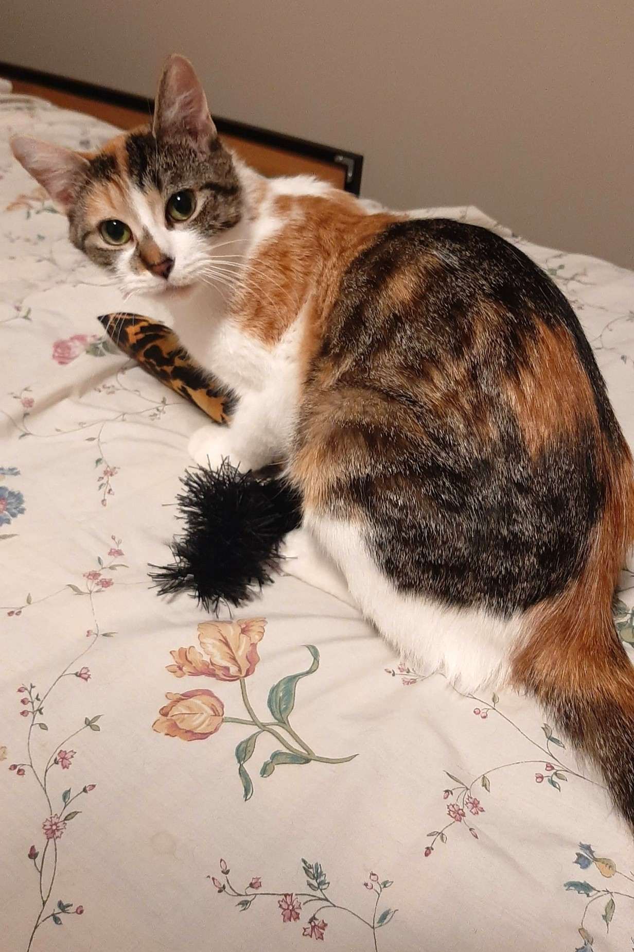 She is a very pretty cat with beautiful calico markings. Annette has a long, elegant frame with long legs and an impressively long tail, about 13 inches, yet she remains a delicate, dainty girl! As her kittens have gotten older, Annette has started to play more. She loves catnip toys, wand toys, and the laser pointer. She has even joined in playing with a couple of her kittens.
