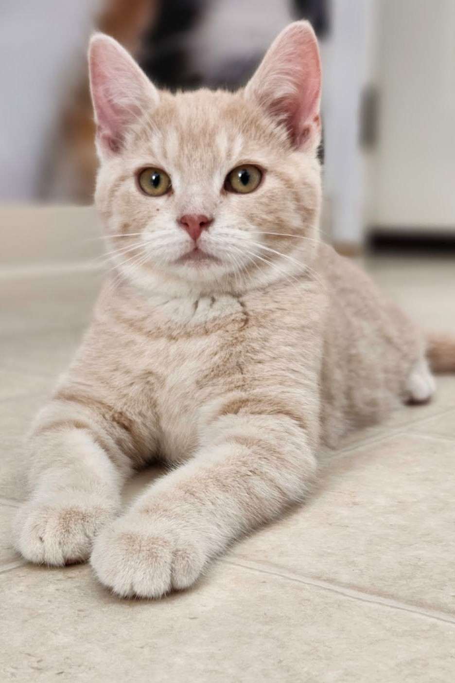 Strudel is just as sweet and irresistible as his name implies! A gorgeous buff kitten with striking orange eyes, he is a high-energy “busy body” who lives for playtime and adventure. Whether he is practicing his pounces or racing through a tunnel, Strudel is a confident boy who approaches the world with a friendly tail-up attitude.
