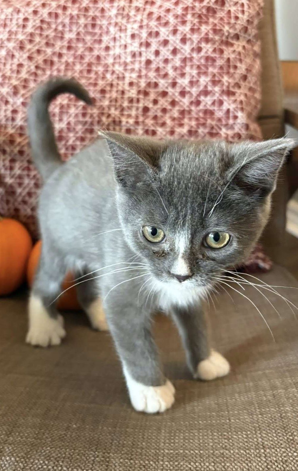 Meet Tundra, the tiniest of her litter! Though small, she’s mighty—quiet by nature but able to hold her own during playtime with her siblings. Tundra enjoys being picked up for pets and kisses, and she’ll even curl up on her foster’s legs for a little rest.
