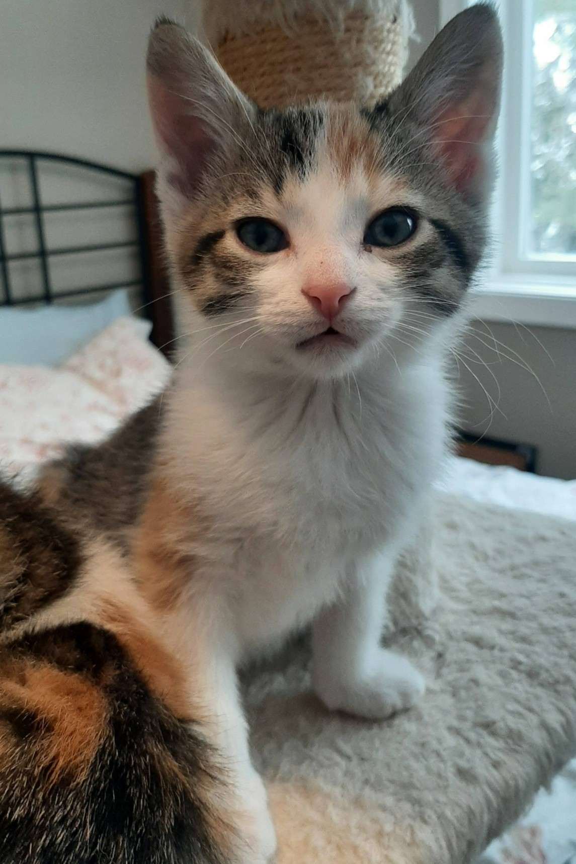 Agnes is a as bold as she is beautiful! A stunning calico and the “mini-me” to her mom. Annette, Agnes is a tiny powerhouse of confidence, mischief, and pure love. The the definition of a “people cat.”, she will choose to squeeze in a few more snuggles before heading for her dish at mealtime. Her favorite human snuggle spots include settling into your lap as soon as you sit down and being rocked in your arms like a baby.
