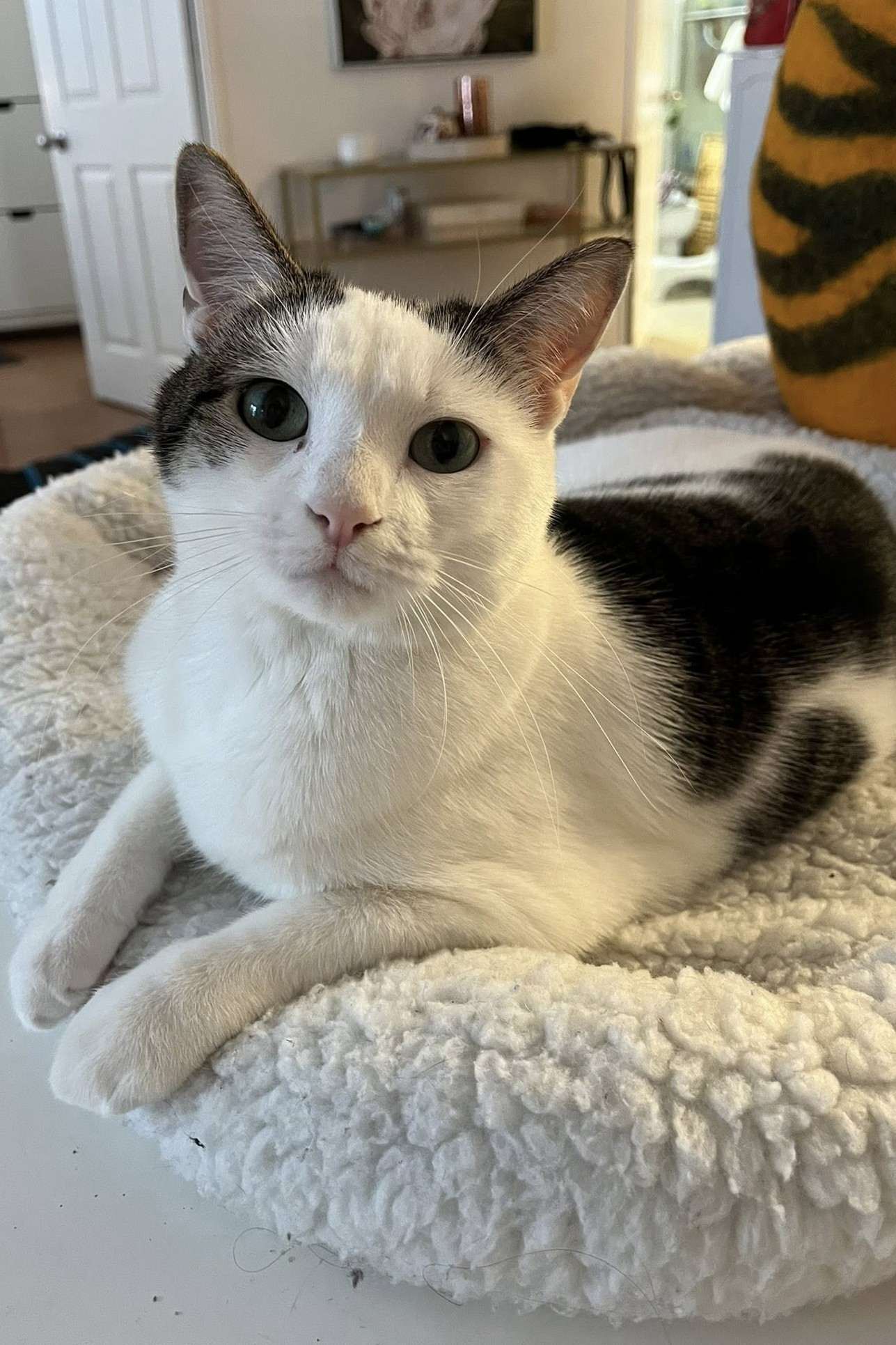Arthur is proving to be loving, sweet, and curious. He and his friend Morgan are absolute snuggle bugs. After setting in, he’s become a very active boy who can be a bit mischievous when he’s looking for entertainment. Arthur is obsessed with the laser toy and anything catnip-related, and has discovered the joys of Cat TV. He also enjoys bird reality TV from the cozy bed in front of the living room window, and his latest obsession is boxes! Arthur is a certified box boy, claiming a recent shipping box as his own, as well as some tissue paper he found that now serves as makeshift bedding and a play thing.