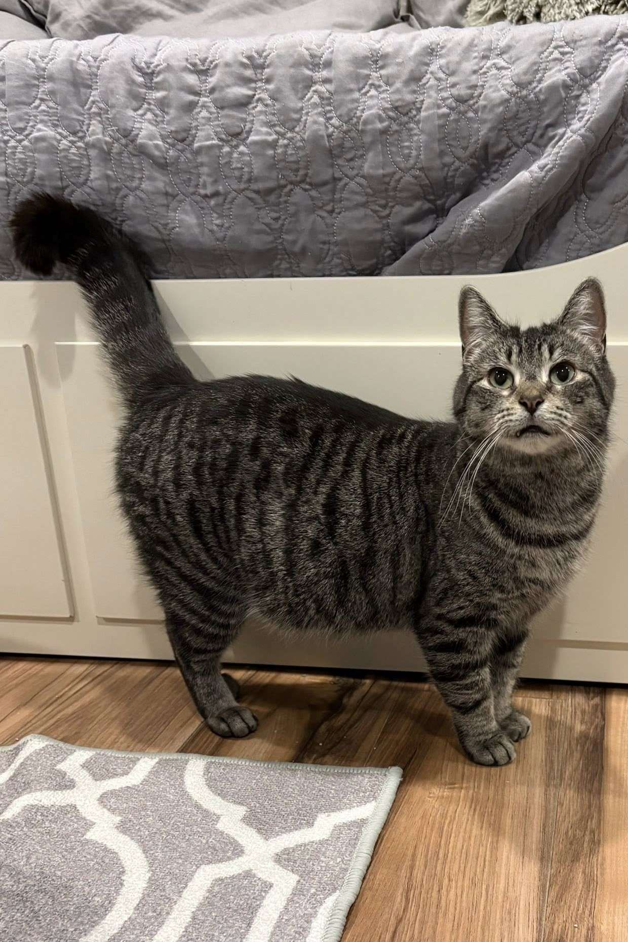 Bagel is a beautiful tabby mom-to-be who has just arrived. This sweet girl is a unique beauty with soft, silky fur, adorable short legs and tail, and a very suspicious “round belly” that suggests kittens may be on the way! Bagel has already shown us her lovely temperament, purring happily while she eats and showing an immediate love for treats and catnip kickers. She is currently settling in and resting. We can’t wait to see what the future holds for this charming “everything” girl.
