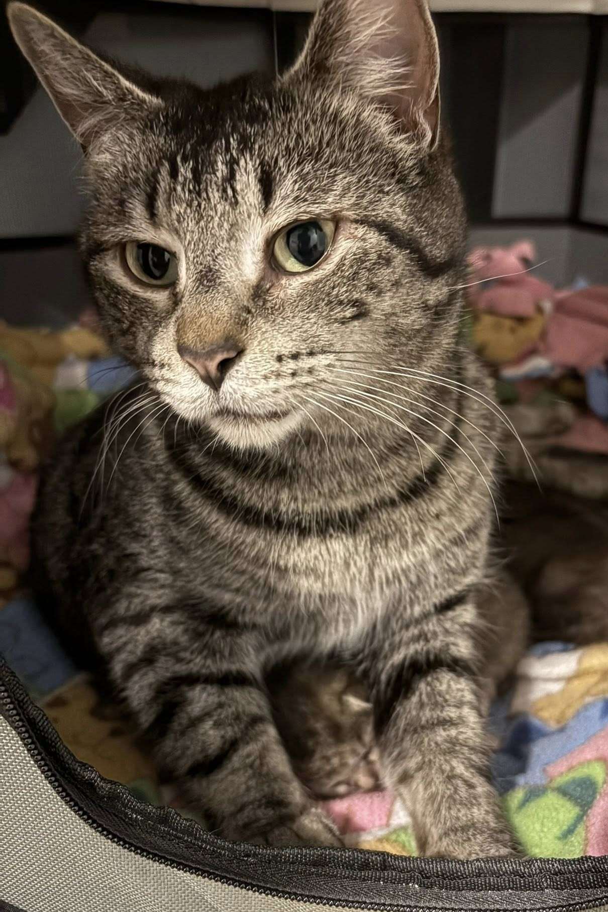 Bagel is a beautiful tabby who is in full-time mama-mode as she raises her three “bagel-bites”, Sunny, Brioche, and Oatmeal.