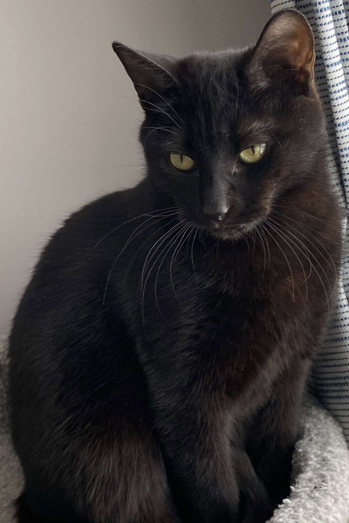 Bastet is a stunning “black panther” kitten with a soul as sweet as she is shy. While she is currently the most reserved of her family, she is bravely working on coming out of her shell every single day. Bastet is a sensitive girl who may flinch at sudden movements or noises, but once she feels safe, her true heart begins to show. She has recently started purring during petting sessions and even took the big step of approaching her foster for attention on her own! It’s clear she craves affection; she just needs a little extra time and a patient hand to show her that she is safe.