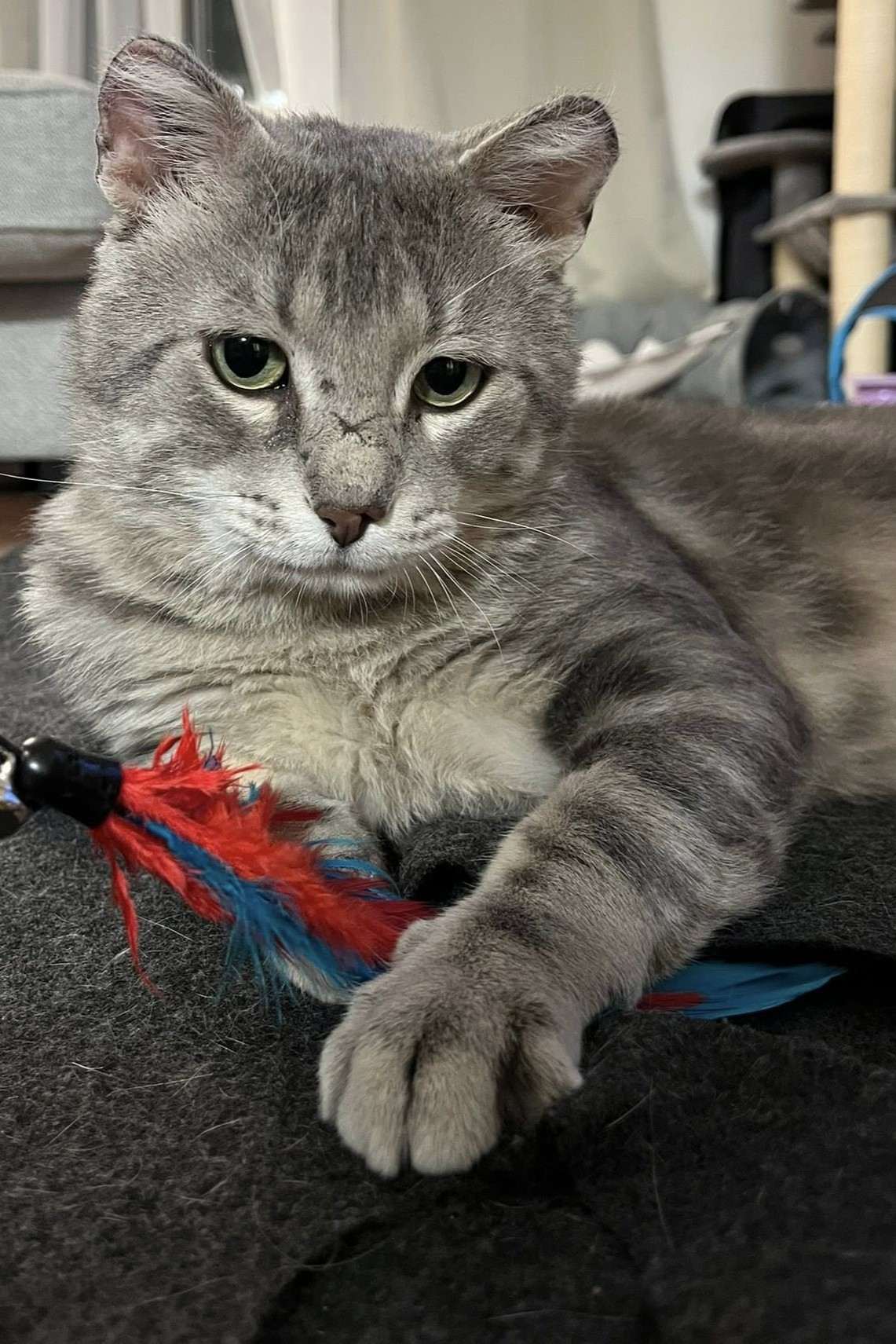 When he isn’t “talking” your ear off, Benito is a ferocious hunter of feather wand toys. He has high energy and loves to play hard before settling down for a serious cuddle session. He’s a world-class lap cat who might actually need to be bribed to leave your side! If you’re looking for a bold, affectionate, and endlessly entertaining companion who loves belly rubs as much as he loves his toys, Benito is ready to join your family.