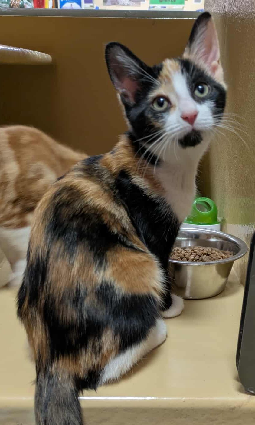 Darby is a striking calico who loves everyone she meets and is full of playful, affectionate spirit! She came into care with her siblings at just 10 days old after losing her mother, and after round the clock care, she has blossomed into a feisty, loveable kitten.