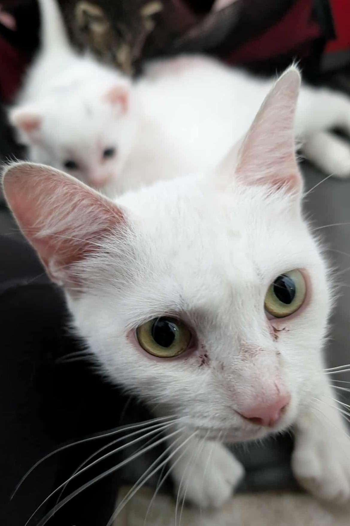 Mama Elysia and her blended family of 3 babies and 4 adopted kittens have settled in nicely and are doing well. Elysia is a wonderful mother and treats every kitten as her own. She watches patiently as all seven eat their fill before she goes to her own food bowl. She nurses and cleans and nurtures all of them as her own. The little ones are doing well with the litter box and are happily eating both wet and dry food. Mama Elysia herself is quite friendly and affectionate, and her whole crew is as adorable as can be! We’ll be sure to share more about their personalities as we get to know them better.