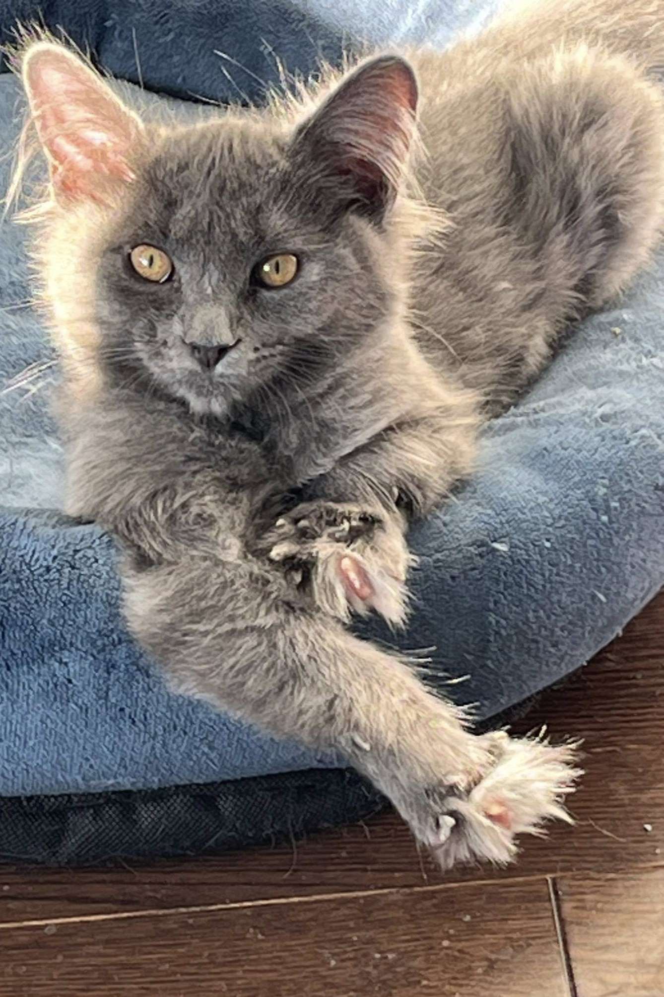 This little grey fluffball may have been born with deformed paws, but don’t let that fool you—he’s full of spirit and energy! Paddington doesn’t miss a beat when it comes to playtime. He adores the ball tower, loves chasing his kitten friends around the room, and always joins in on the fun.