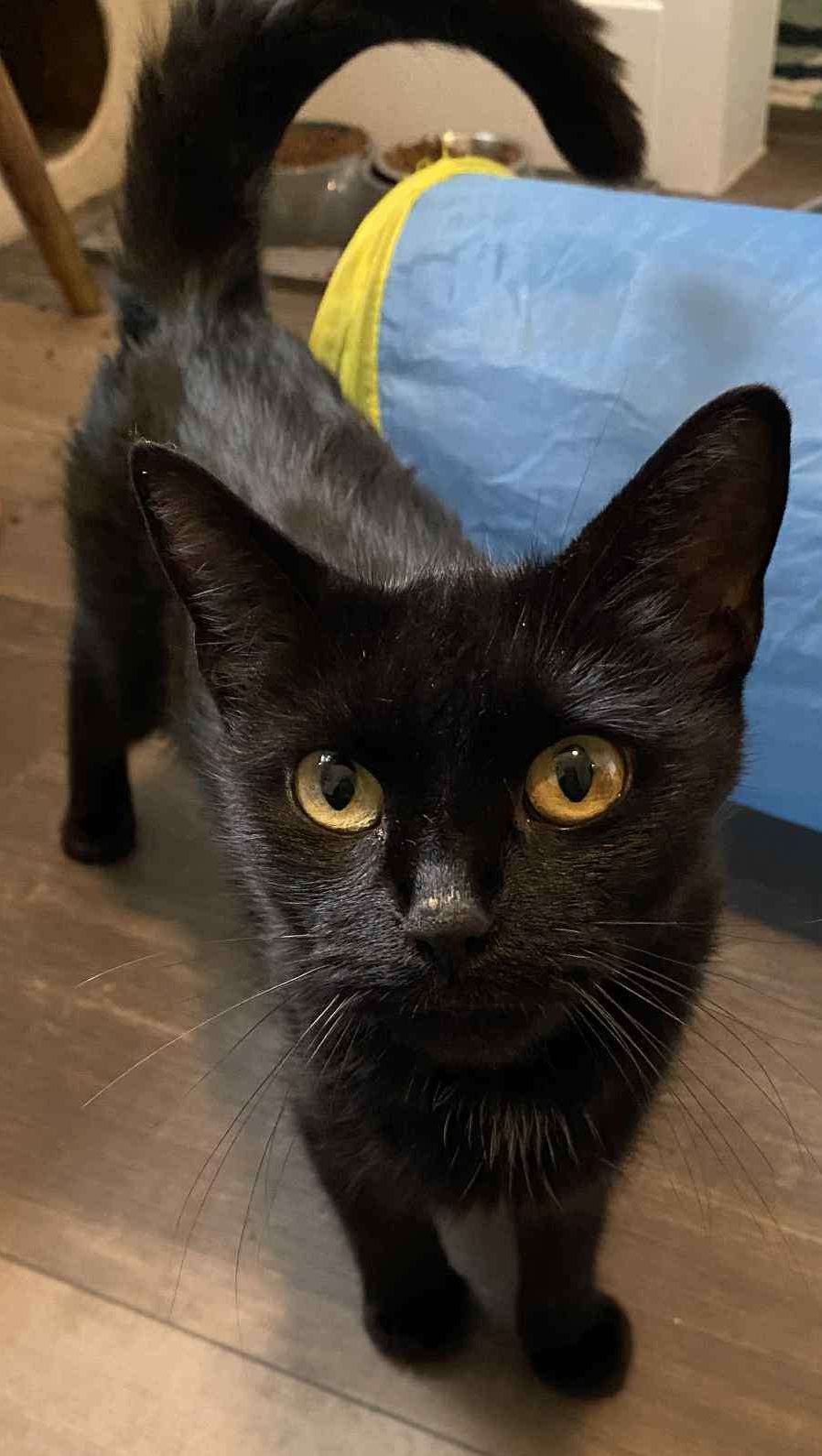 In her time in care, she has met many friends and family members and has never been shy or frightened, always proving to be friendly and comfortable in social settings. She was fine sharing her space with another cat, comfortably putting him in his place when he got too playful, but also not aggressive.