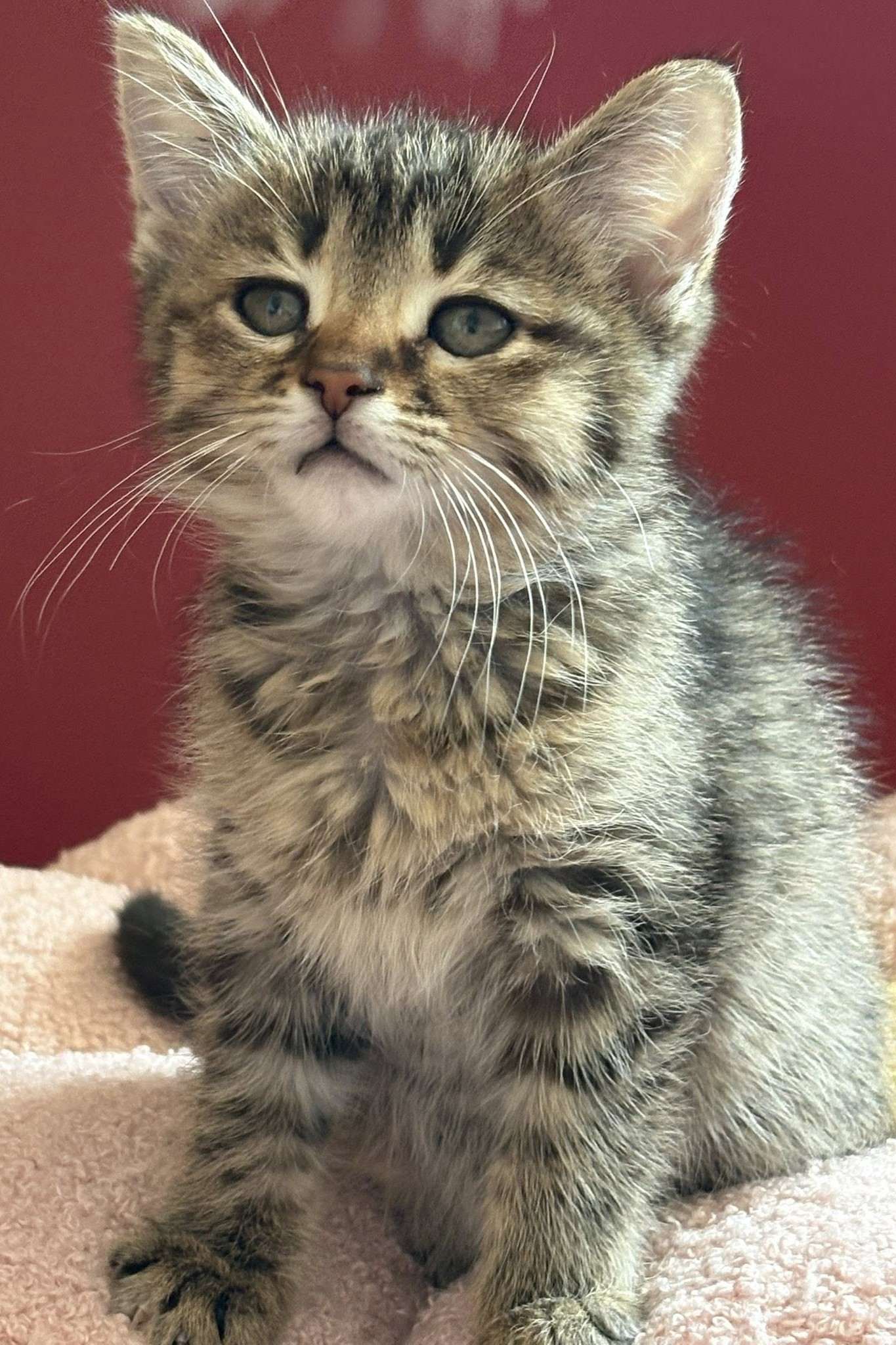 Puff is a sweet little lady with the biggest heart! This adorable tabby features sweet, unique patches of orange and peach on her legs. She may be small, but she’s definitely mighty—she’s the wrestling champion of her litter and loves to defend her toy “kingdoms.”
