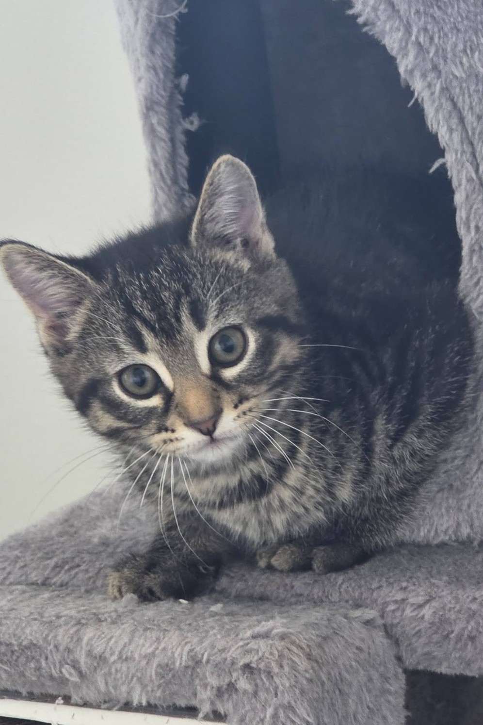 Don’t let those sweet tabby looks fool you—Watt is the official instigator of all foster room shenanigans! A soccer star in the making, he loves ping-pong balls and testing out every toy he can find. He’s even claimed the cat tree cave as his personal fortress, bravely defending his favorite nap spot from his wrestling siblings.