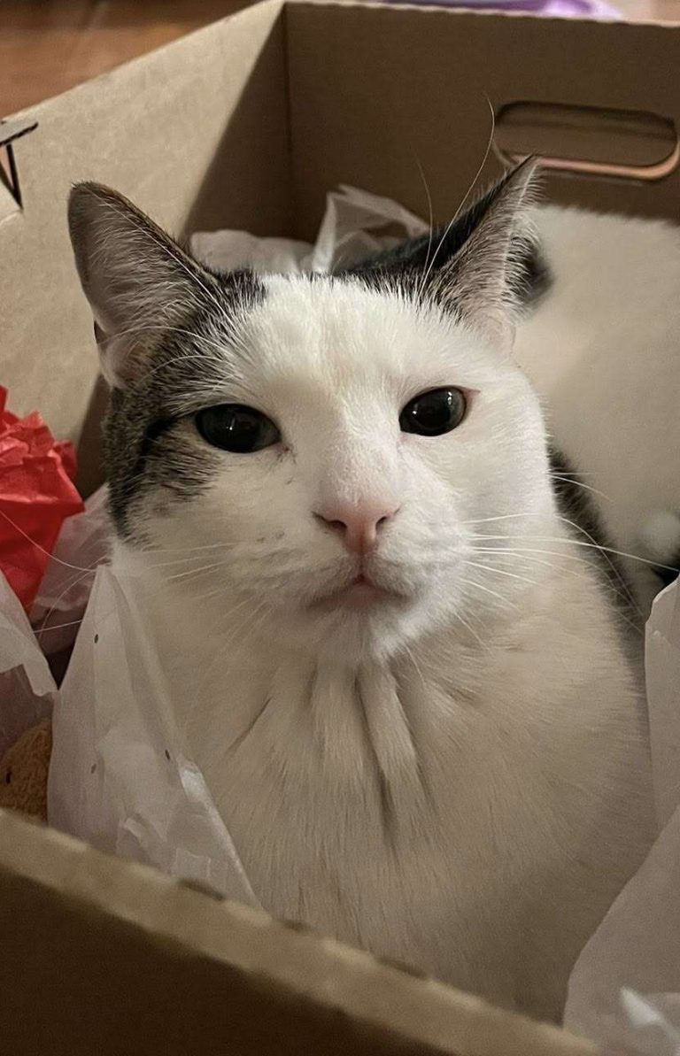 Arthur is proving to be loving, sweet, and curious. He and his friend Morgan are absolute snuggle bugs. After setting in, he’s become a very active boy who can be a bit mischievous when he’s looking for entertainment. Arthur is obsessed with the laser toy and anything catnip-related, and has discovered the joys of Cat TV. He also enjoys bird reality TV from the cozy bed in front of the living room window, and his latest obsession is boxes! Arthur is a certified box boy, claiming a recent shipping box as his own, as well as some tissue paper he found that now serves as makeshift bedding and a play thing.
