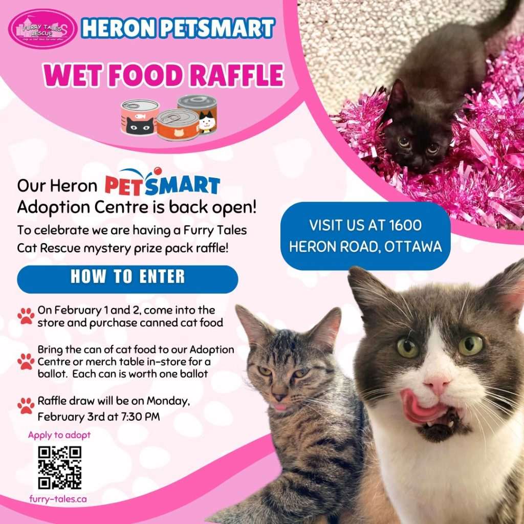 💻How? – Pre-apply to adopt at https://furry-tales.ca/adoptable-cats/ or come to PetSmart (1600 Heron Rd).