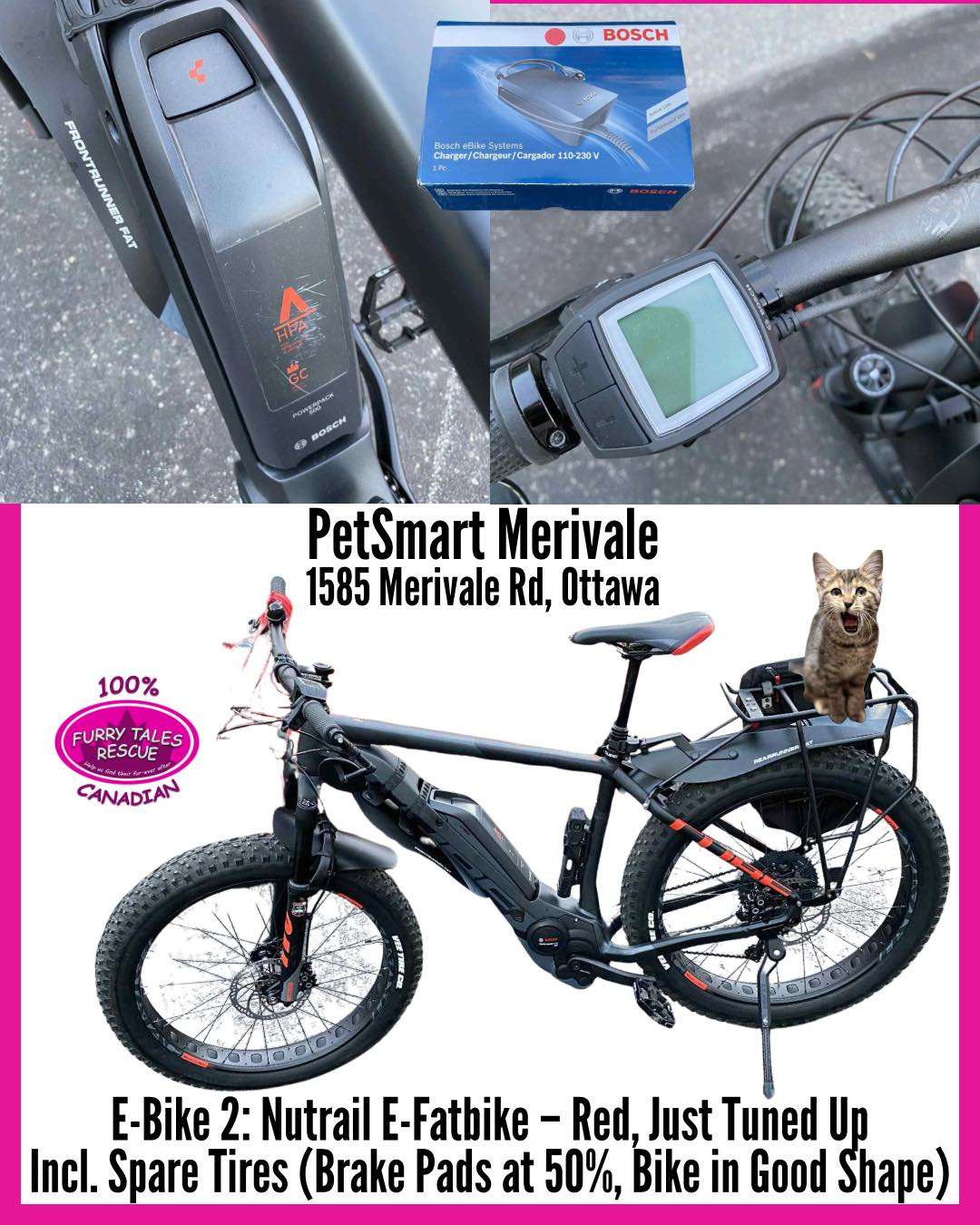 ❤️🚲🖤 At PetSmart Merivale, you will find the red and black Nutrail E-Fatbike (used). It also includes spare tires and was tuned up at Scooteretti Bike Shop. The brake pads are at 50%.
