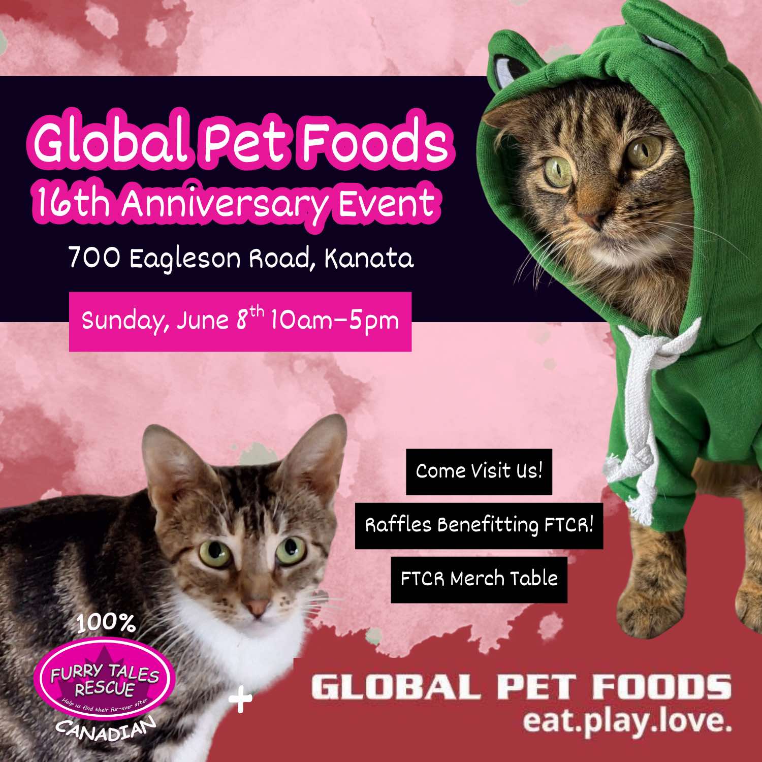 Global Pet Foods is excited to announce their annual Anniversary Event, celebrating 16 years, on Sunday, June 8th, 2025. We are honored that they have chosen to help raise funds for Furry Tales Cat Rescue as part of this event.