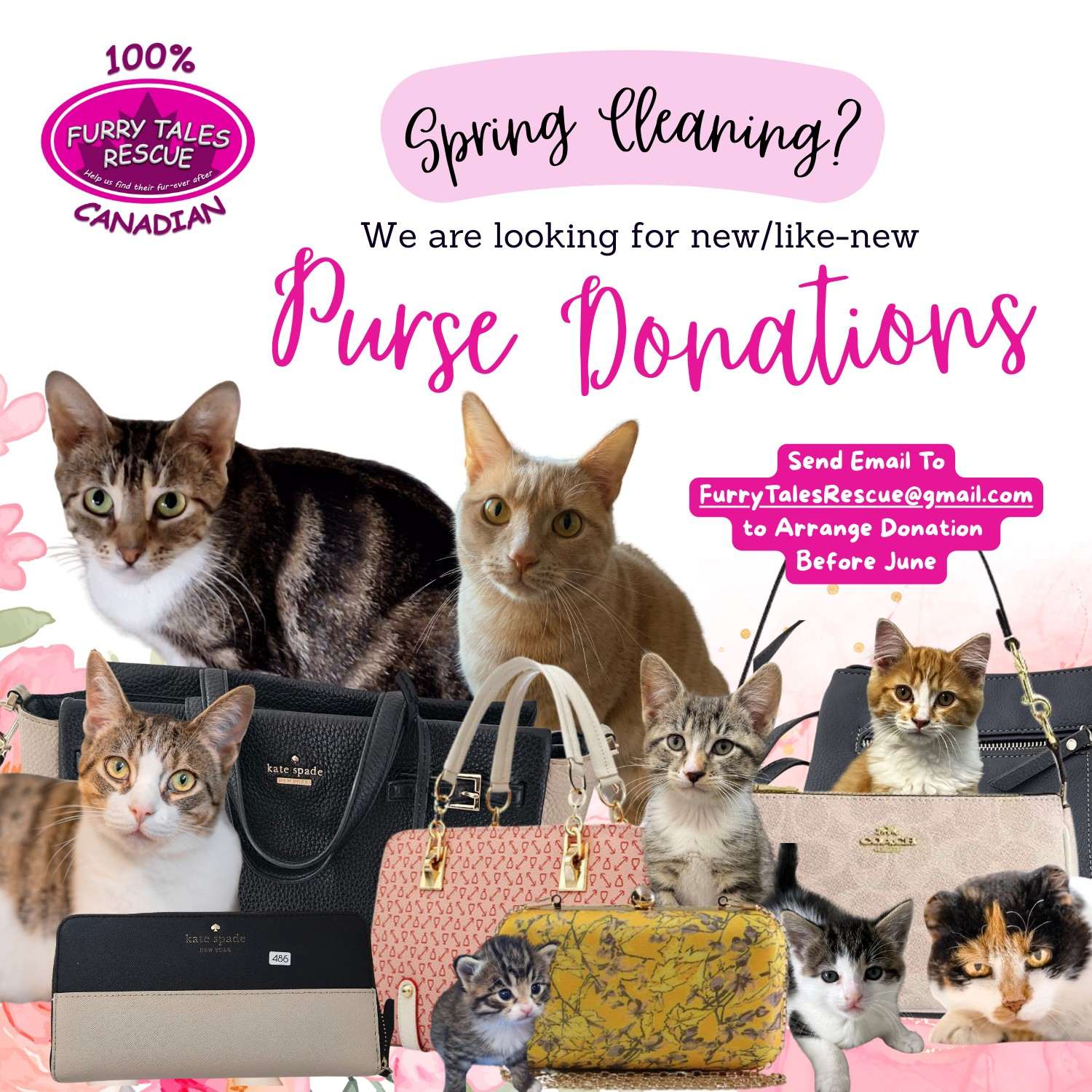 We currently have 119 cats and kittens in care at Furry Tales Cat Rescue and will be holding a purse auction to raise funds for spay and neuter. If you have any purses in new or like-new condition that you would like to donate, items can be dropped off at any of our donation drop-off locations.