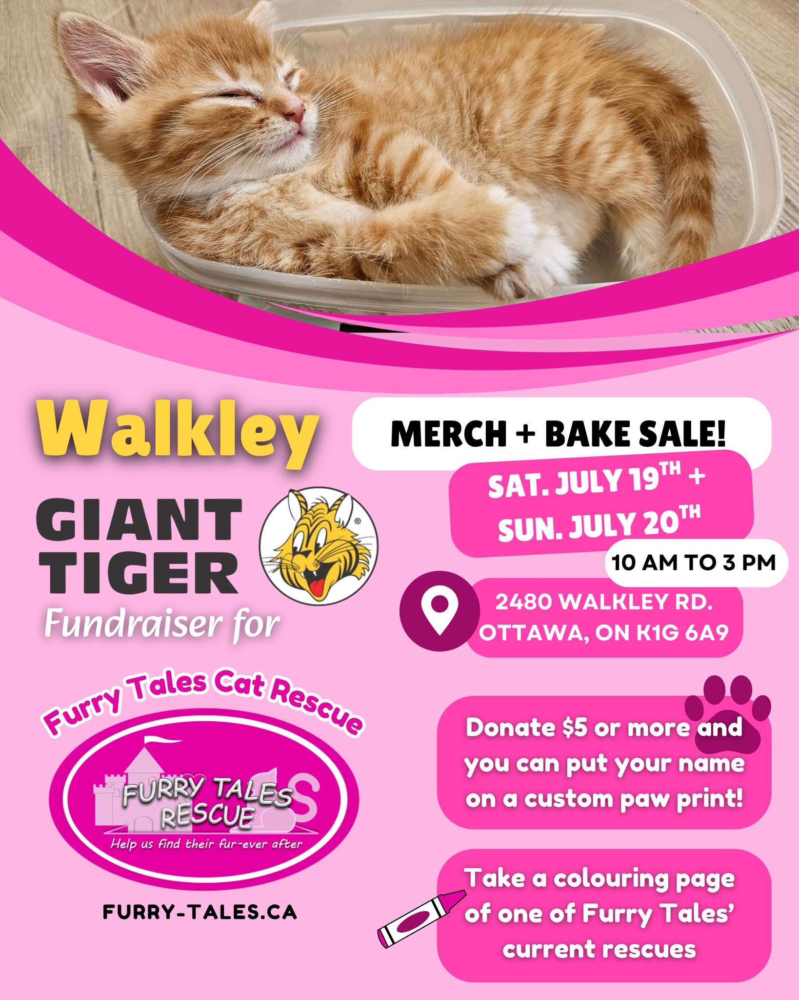 For the ENTIRE month of July, Walkley Giant Tiger is fundraising for Furry Tales Cat Rescue! Ready to make a purr-fect difference? While you're in-store, swing by the cash registers...