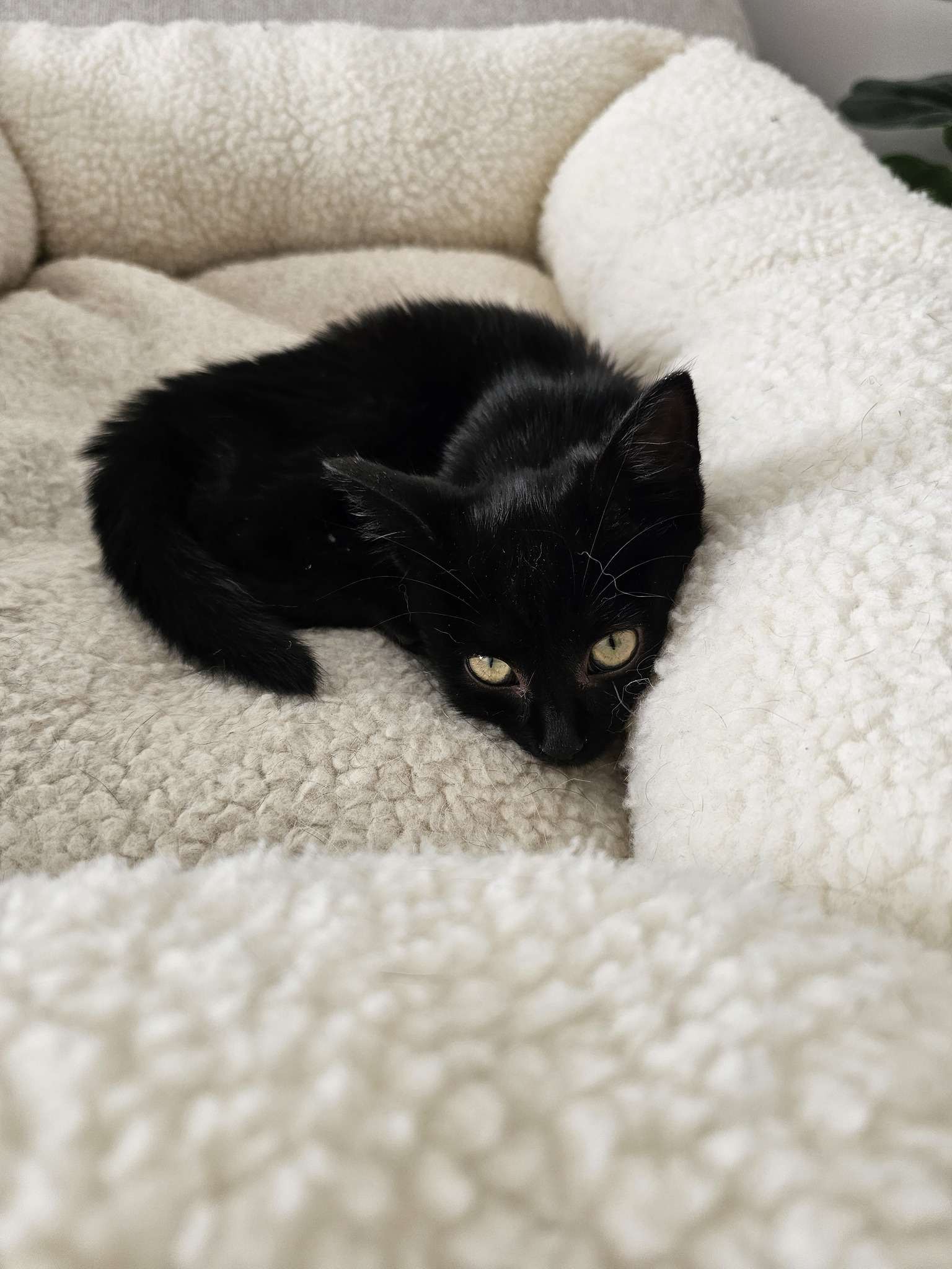 Fast forward to March 26th, 2025 Floyd is now just over a month old and today for the first time he pooped on his own, he even did it in the litter box. I’ve never been so happy to see poop. He is weaning, eating more solid food than drinking formula from the bottle. He is discovering his paws and his tail and likes to play with scrunchy toys. He snuggles under my hair, purring like crazy.