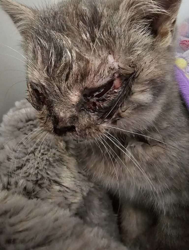 Xena arrived in our care as an emergency: a young kitten who had survived something unimaginable. She had been brutally attacked, and her injuries were severe.